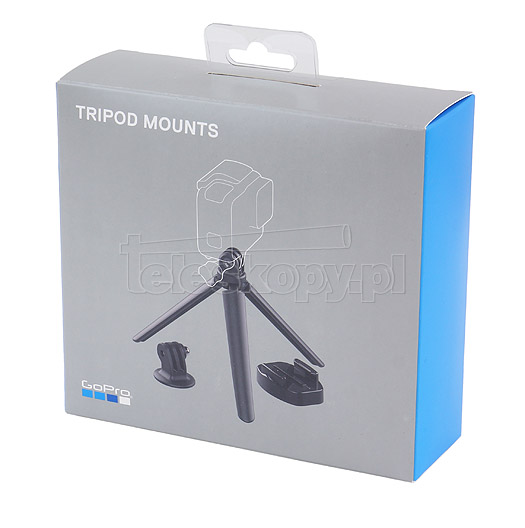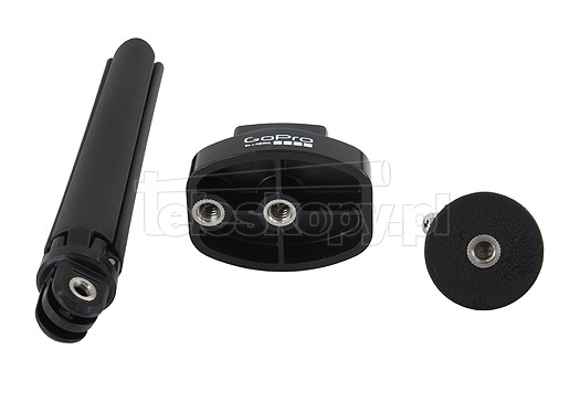 Dwa mocowania statywowe oraz mini-statyw do Gopro. • adapter statywowy (gwint żeński 1/4" foto na śrubę / łapki GoPro) • adapter z dwoma gwintami żeńskimi 1/4 cala na szybkozłączkę wsuwaną GoPro • nierozsuwany mini statyw do zamocowania GoPro przez śrubę i łapki GoPro