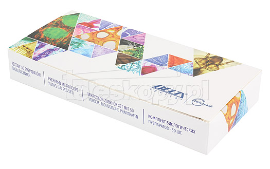 Zestaw 50 sztuk wysokiej jakości preparatów biologicznych zapakowanych w lakierowane, drewniane pudełko. Zestaw zawiera zarówno tkanki roślinne jak i zwierzęce.