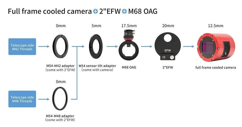 • możliwość zastosowania z kołem filtrowym EFW 2" i szukaczem pozaosiowym ZWO M68 OAG