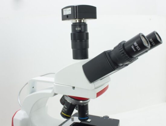z soczewką powiększającą 0,5x z gwintem C-mount (jest na stanie mikroskopu), lecz dołączona soczewka 0,5x jest niewystarczająca przy fotografowaniu obiektów transparentnych (obiekty przeźroczyste, barwienia przyżyciowe) spod obiektywów 40x