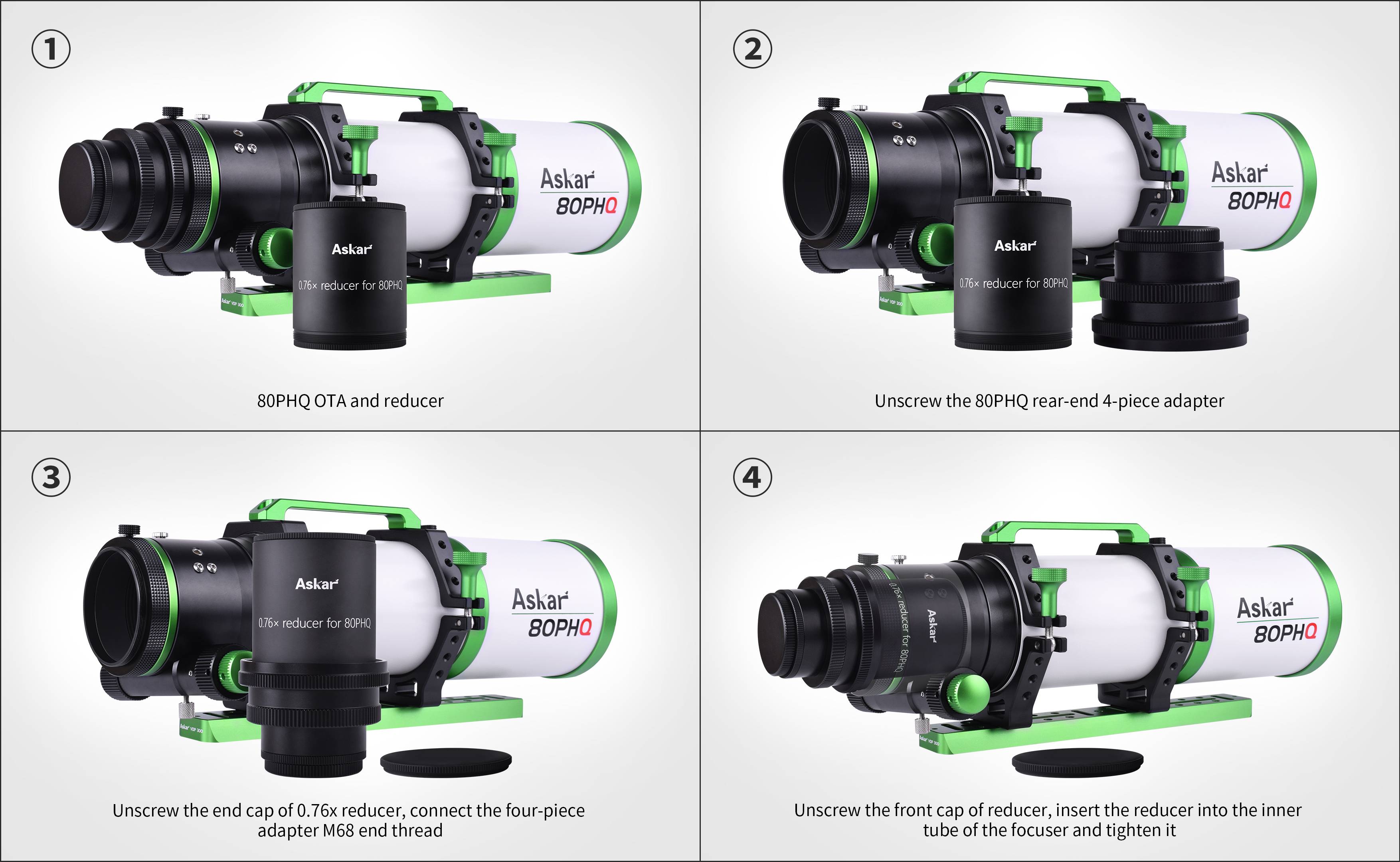 Reduktor Askar f/5,7 (80PHQ) został opracowany jako dedykowane akcesorium do astrografu Askar 80PHQ. Gwarantuje on znakomitą korekcję pola, dzięki czemu idealnie współpracuje on z profesjonalnymi aparatami i kamerami wyposażonymi w matrycę pełnoklatkową.
