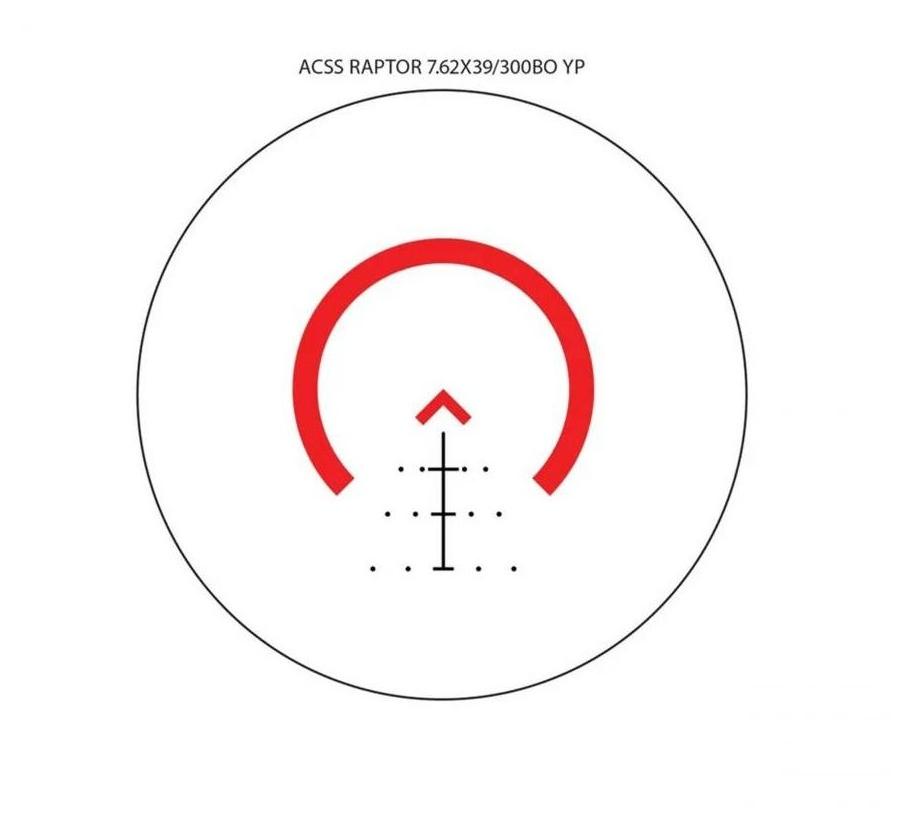 ACSS Raptor to autorska siatka Primary Arms wyskalowana do balistyki amunicji 7,62/.300BLK. Siatka ACSS Raptor w centralnej części ma cieńszy szewron (odwrócona litera V) otoczony grubszą podkową. Pod szewronem zamieszczono podziałkę do szacowania dystansu oraz precyzyjnego rażenia celów na różnym dystansie. W rezultacie powstała intuicyjna siatka, która świetnie sprawdzi się do strzelania dynamicznego na krótkim dystansie i precyzyjnego na średnim dystansie. ACSS to niezwykle prosty i jednocześnie funkcjonalny system celowniczy, którego zalety docenili początkujący i doświadczeni strzelcy na całym świecie. Podziałkę wyrażono w metrach, co znacząco ułatwia korzystanie z funkcji siatki celowniczej.