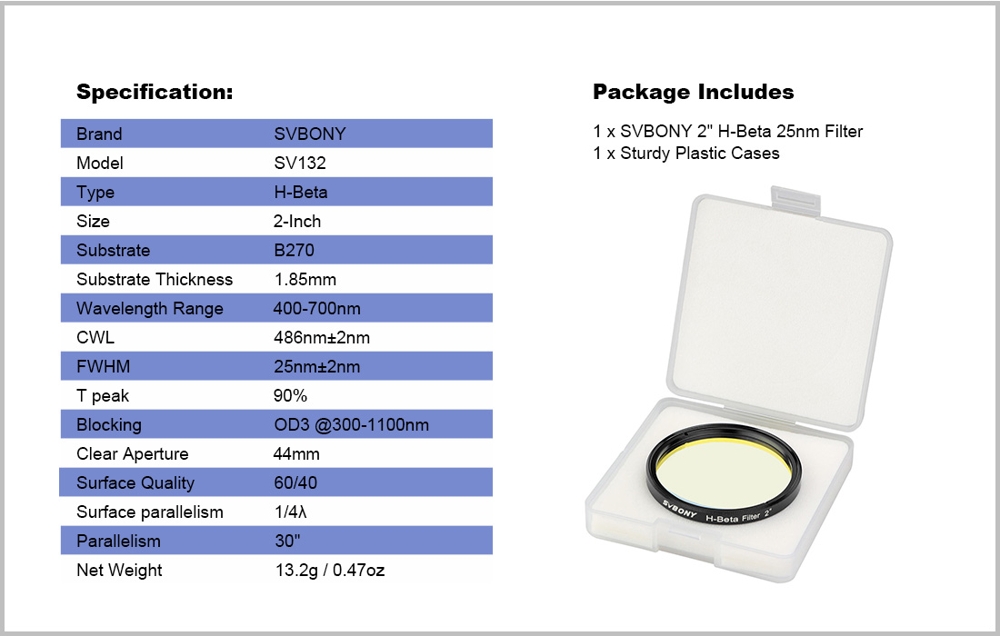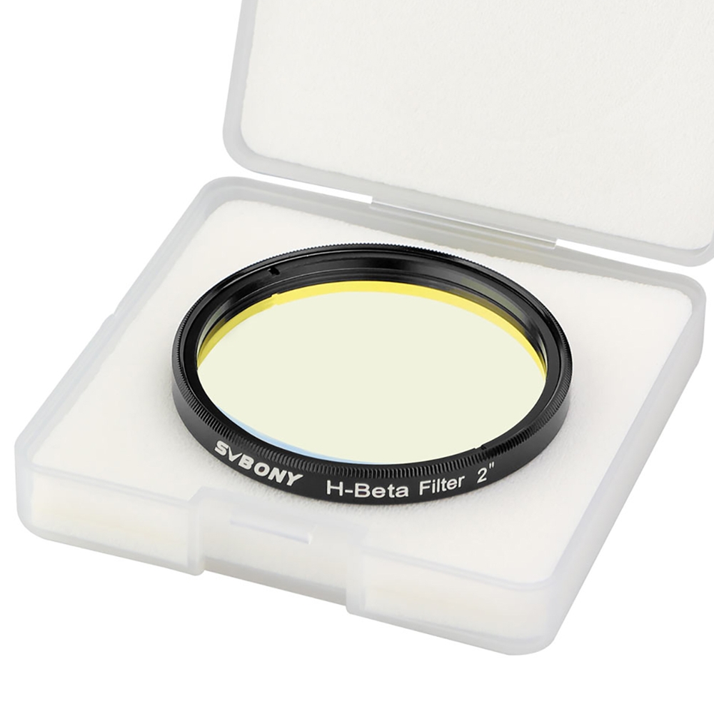 SVBONY H-beta SV132 2" 25 nm to profesjonalny filtr astronomiczny o szerokości połówkowej okna transmisyjności (FWHM) wynoszącej 25 nm. Filtr ten zaprojektowany został jako dedykowany do prowadzenia obserwacji wizualnych obiektów mgławicowych, takich jak leżąca w konstelacji Perseusza mgławica Kalifornia (NGC 1499) lub mgławica Koński Łeb (NGC 2023) w Orionie.