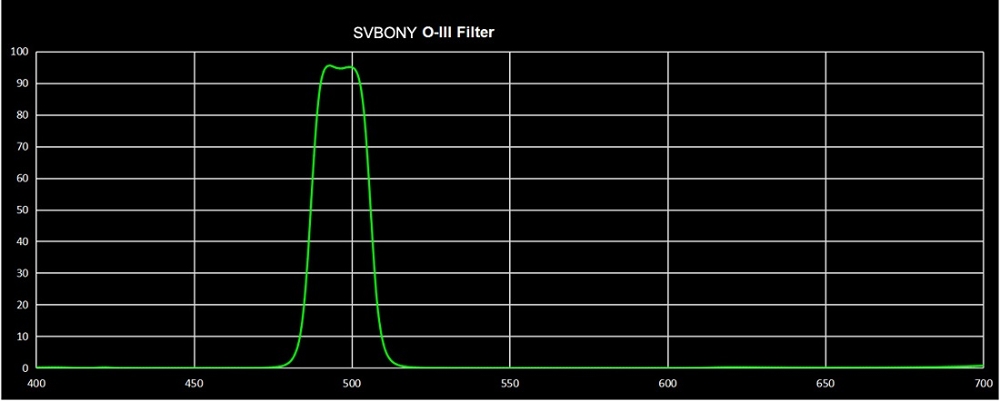 SVBONY O-III SV115 1,25" 18 nm to profesjonalny filtr astrofotograficzny o zwiększonej szerokości połówkowej okna transmisyjności (FWHM) wynoszącej 18 nm i charakterystyce widmowej zoptymalizowanej pod kątem skutecznego wycinania zanieczyszczenia świetlnego. Przepuszcza on światło o długości fali 495,9 i 500,7 nm emitowane przez zjonizowane atomy tlenu, którego rejestracja ma szczególnie duże znaczenie przy fotografowaniu mgławic emisyjnych.