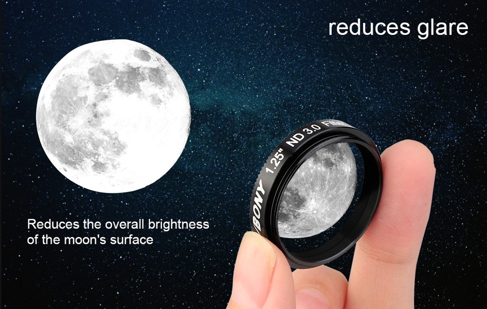 Svbony SV139 1,25" ND 1,2 to profesjonalny filtr księżycowy, który dzięki ograniczeniu ilości światła minimalizuje wpływ poświaty i umożliwia dostrzeżenie większej ilości szczegółów na powierzchni srebrnego globu.