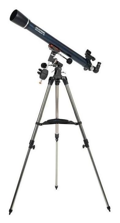 Refraktor (teleskop soczewkowy) na montażu paralaktycznym z mikroruchami, wszechstronny instrument optyczny do obserwacji astronomicznych oraz jako luneta do obiektów naziemnych. Przeznaczony głównie do obserwacji Księżyca oraz planet. Obiektyw o rozmiarze 70 mm umożliwia obserwacje Słońca - plam słonecznych (po założeniu filtru słonecznego dostępnego w naszym sklepie), Księżyca - kraterów, mórz, gór, Merkurego - fazy, Wenus - fazy, Marsa - tarcza, szczegóły w czasie opozycji, Jowisza (pasy zwrotnikowe, księżyce Jowisza), Saturna (pierścień, Tytan - największy księżyc), tarczy Urana i Neptuna. W zasięgu możliwości tego teleskopu są jaśniejsze komety (gdy widoczne), planetoidy oraz dziesiątki galaktyk, mgławic, gromad kulistych i otwartych, niezliczone gwiazdy podwójne i wielokrotne. Teleskop ze względu na małą wagę idealnie nadaje się jako sprzęt podróżny / przenośny.