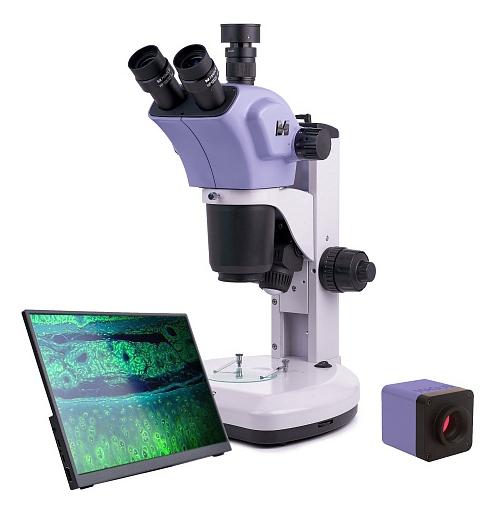 W zestawie znajduje się kamera MAGUS CHD10 (2 MP, HDMI, 60 kl./s, Full HD, matryca SONY Starvis) oraz monitor LCD MAGUS MCD20 (13,3”, IPS, 1920x1080). Kamera nie wymaga komputera – podłączenie przez HDMI umożliwia bezpośrednie wyświetlanie obrazu na ekranie. Monitor można ustawić na statywie lub płasko. Mikroskop wyposażono w głowicę trójokularową, mechanizm precyzyjnej i zgrubnej regulacji ostrości oraz komplet płytek stolika. Oświetlacze LED mają żywotność 50 000 h.