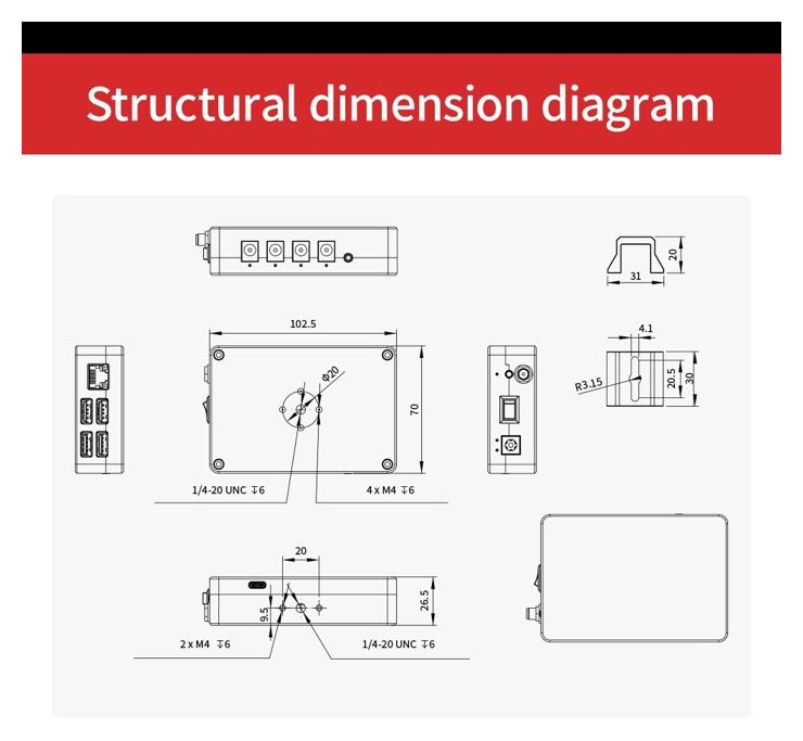 • złącza: Gigabit Ethernet, USB 2.0 (2x), USB 3.0 (2x), USB-C (1x), wyjścia zasiniania 12 V DC (4x), wyjście wężyka spustowego migawki DSLR (1x)