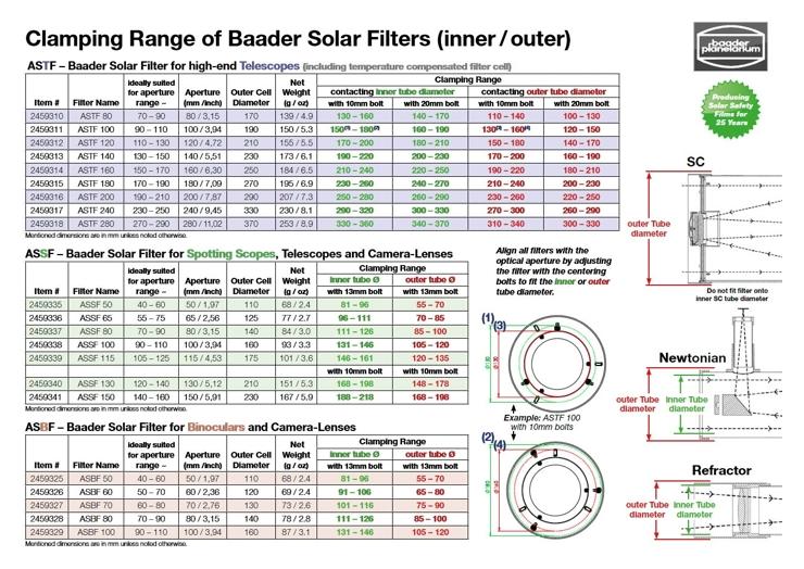 Profesjonalny filtr słoneczny wykonany z precyzyjnie wyciętej laserowo, metalowej celi, w której umieszczono oryginalną folię mylarową Baader Planetarium AstroSolar® OD=5,0. Dokładna regulacja średnicy mocowania umożliwia zamocowanie filtra na dowolnym teleskopie astronomicznym, o aperturze od 110 do 130 mm. Folia mylarowa o gęstości optycznej OD=5,0 jest filtrem o wysokiej jakości obrazu przewyższającej wiele popularnych filtrów szklanych dostępnych na rynku. Bezpieczne, estetyczne i trwałe mocowanie w formie aluminiowego pierścienia nie nagrzewa się i nie deformuje pod wpływem słonecznego ciepła, przez co zapewnia trwałe mocowanie dla folii. Jest to filtr słoneczny dający najwyższą na rynku jakość obrazu.