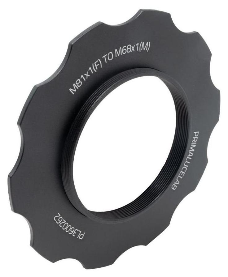 Adapter M81 → M68 (female) z pierścieniem stop dla ESATTO 3" / ARCO 3" (PrimaLuceLab, SKU: PL3600262) umożliwia podłączenie akcesoriów z gwintem zewnętrznym M68 × 1 do wyciągu ESATTO 3" lub rotatora ARCO 3", które posiadają frontowy gwint M81 × 1. Zintegrowany pierścień kontrujący (stop-ring) pozwala precyzyjnie ustawić głębokość wkręcenia adaptera i zablokować go w wybranej pozycji, ułatwiając utrzymanie właściwego back-focusu oraz orientacji przyłączonego urządzenia.
