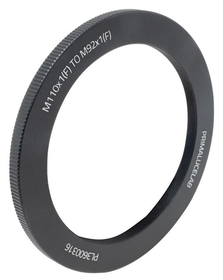 Adapter M110 → M92 (female) for ESATTO 4" (PrimaLuceLab, SKU: PL3600316) umożliwia podłączenie akcesoriów z gwintem zewnętrznym M92 × 1 (np. reduktorów, flattenerów, rotatorów) do wyciągu ESATTO 4", którego frontowy gwint ma średnicę M110 × 1. Adapter gwarantuje osiowe, sztywne połączenie oraz minimalny przyrost długości toru optycznego, zachowując pełną przepustowość dla matryc pełnoklatkowych.
